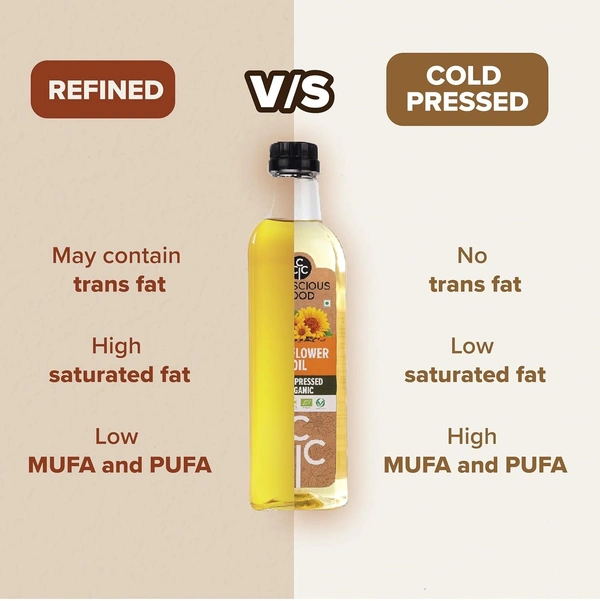 - Cold-pressed : Sunflower oil is organic certified as well as cold-pressed. Starting from seed to its final product, everything is organically sourced, manufactured, and packed as per the standards. This product is considered an ‘essential’ culinary oil in your kitchen. Straight from the farm, delivered to your kitchen